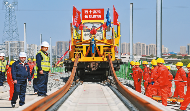 九月八日,在西十高鐵建設現場西安東至藍田作業區間,施工人員將首對五百米長的無縫鋼軌平穩鋪設在無砟軌道板上,標志著由西成客專陜西公司建設、中鐵四局施工的西十高鐵全線鋪軌正式啟動。西十高鐵西起陜西省西安市,向東南穿越秦嶺山脈,終點為湖北省十堰市,正線全長二百五十五點七六公里,設計時速三百五十公里。