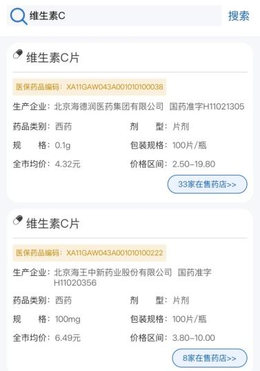 第四步:以搜索維生素C為例,可以看到下方展示了在售的相關商品及價格等信息。