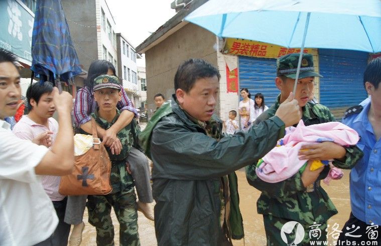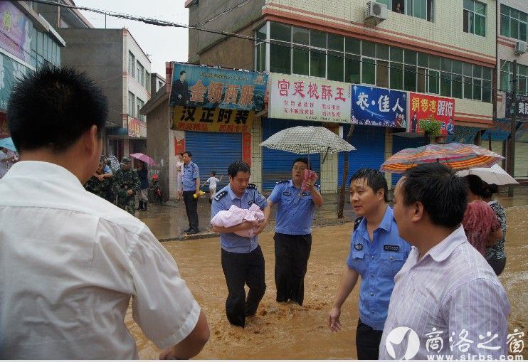 本網訊(周銀祥 王楓)7月23日晚8時至24日12時,商南縣遭遇持續強降雨,河水猛漲,泥石流頻發,平均降雨量80毫米,7月24日上午11時許,縣河洪水翻壩,洪水涌入縣城,濱河路、南大街、文化路、長新路、東街等多條街道被淹,縣婦幼保健院也成了一片汪洋,猛漲的洪水翻過攔河大壩將100多名新生嬰兒和孕產婦圍困,情況萬分危急。縣委、縣政府按照防汛搶險預案,由副縣長、公安局長趙黎軍帶隊的30多名抗洪搶險突擊隊在第一時間趕到現場,營救工作全面展開。