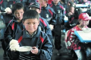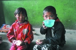 一個(gè)饅頭加一碗奶茶或一碗白開水,這就是他們的午餐。講臺(tái)、走廊、教室的屋檐下,這就是他們的食堂。在這些海拔3500米以上的學(xué)校里,喝上熱水也不是一件容易的事。有的孩子說,在學(xué)校里吃得比家里好。