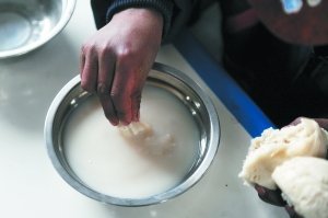 一名學(xué)生正在享用饅頭蘸奶茶午餐。天氣冷,熱水又少,學(xué)生們不常洗手