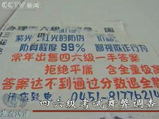 全國大學英語四六級考試是教育主管部門組織實施的一項標準化考試,每年參加考試的考生達到了240多萬,它同時也是各級人事部門錄用大學畢業生的重要參考。昨天是全國大學四六級英語考試的日子,記者在黑龍江省哈爾濱市的多所大學發現,考前、考中販賣答案現象異常猖獗。