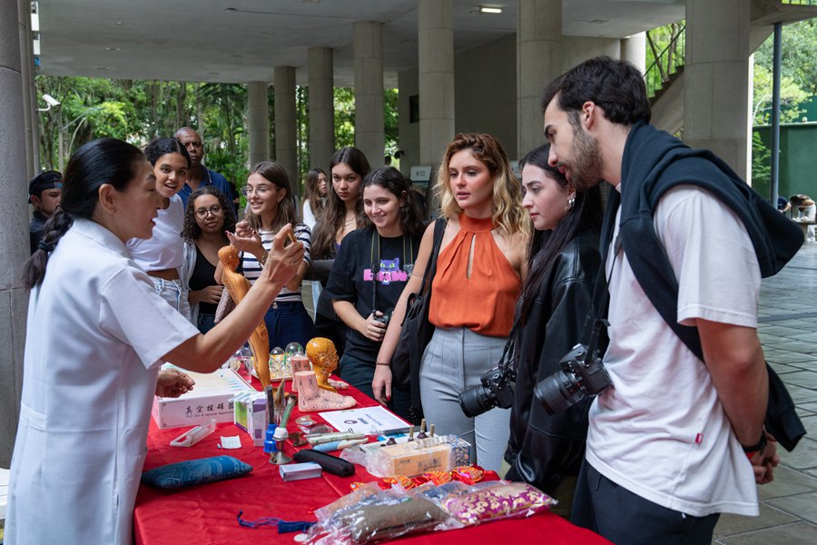 2025年4月15日,在巴西里約熱內(nèi)盧天主教大學(xué)舉辦的“國際中文日”慶祝活動上,學(xué)生們觀看中醫(yī)療法展示。新華社記者 王天聰 攝