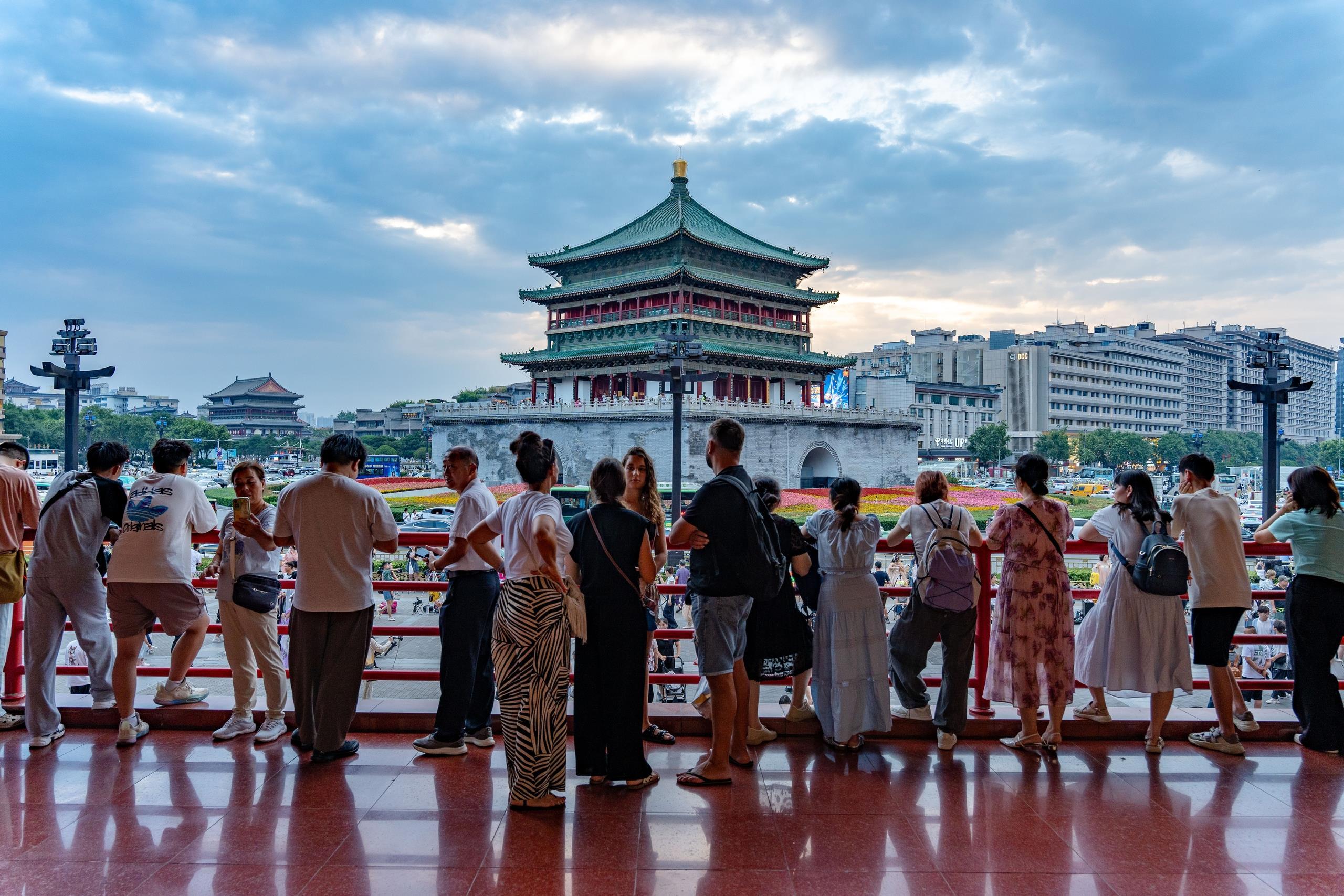 △游客在陜西西安市碑林區(qū)鐘樓景區(qū)拍照打卡。