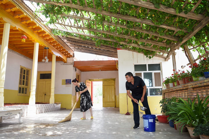 在新疆喀什地區疏附縣阿亞格曼干村,村民阿卜都克尤木·肉孜(右)和妻子在打掃庭院(2022年6月10日攝)。新華社記者 丁磊 攝