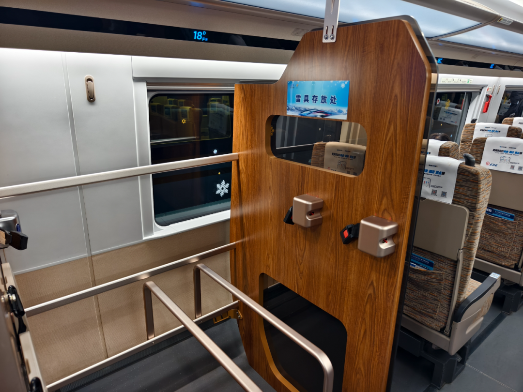 為了更好滿足旅客與雪具隨車同行的需求,鐵路部門統(tǒng)籌考慮旅客安全、乘車秩序和雪具運輸需求,選取京張高鐵北京北至崇禮間的G7831/2/3/4/5/6/7/8次列車試點開展“雪具便利行”服務(wù),對動車組列車二等座車廂部分座椅進行了適應(yīng)性改造,設(shè)置專門的“雪具存放處”,旅客選擇該服務(wù)后可攜帶長、寬、高之和不超過200厘米的雪具同車出行,滑雪更加方便快捷。對于長、寬、高之和超過200厘米的雪具,由于高鐵列車車內(nèi)空間限制,仍需辦理托運。