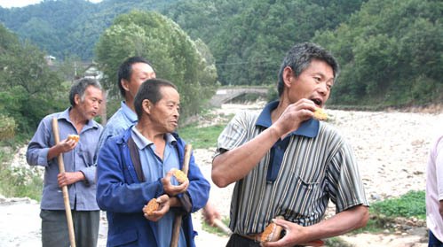 水毀修復(fù)工地的農(nóng)民工兄弟品嘗著鄉(xiāng)干部送來的月餅