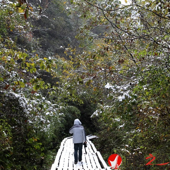 10月27日晚,由于氣溫驟降,商南縣金絲峽落下了今年的第一場(chǎng)雪。28日,漫游景區(qū),晶瑩的白雪與滿山紅葉交相輝映,讓秋冬之交的金絲峽更顯嫵媚、迷人,也為景區(qū)平添了幾分神秘色彩。(胡金鑫 李治軍 周程 攝)