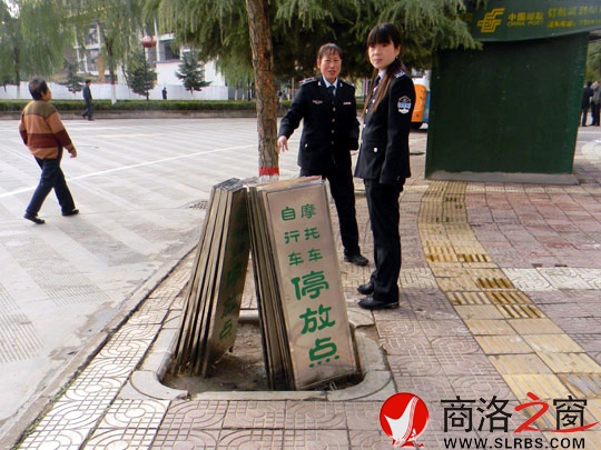 兩位城管工作人員正在整理"自行車、摩托車免費(fèi)停放點(diǎn)"牌