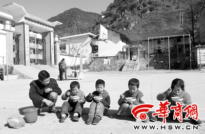 朱金魁將午飯送到學(xué)校,孩子們吃得很香。4個(gè)孩子的戶(hù)口讓他茶飯不思