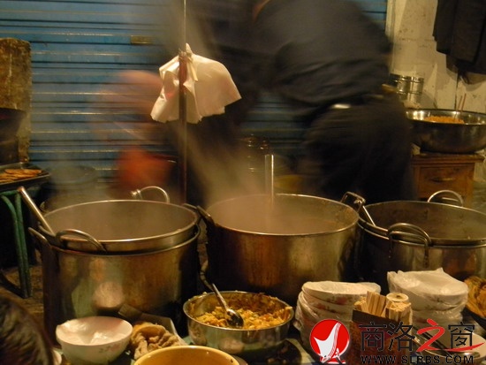 三四口大鐵鍋,五六條長板凳夾一個矮桌子,一對對男女老少擠坐在矮桌兩旁,呼呼抱著個碗喝個不停,人們喝著小紅豆伴著玉米面慢慢熬成的粥,讓旁觀者也讒言欲滴。精于做小吃生意的主人,不像豪華酒店和時尚酒吧門前的迎賓小姐那般光鮮照人,他們目不斜視,專心致志做手上的活。那些腰系圍布,衣著整潔,動作利索的大叔或大姐,操著商洛本地特色方言: "--來一碗吧!"語辭之中,絕無強人所難之意,但實在不忍心挪步。于是,坐下來,"給我來一碗糊湯…--",案板上,放著小菜,酸菜,拌蘿卜絲,辣椒,任你選,由你加。一塊五毛錢,會讓你覺得囔中之物,恰到好處,喝完會有十分的滿足感。