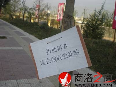 本網訊(記者 彭程)記者12月9日在丹江立交橋附近的綠化帶人行道旁看見了這樣一個紙牌子,上面寫著"折此樹者速去殘聯領補貼"幾個字樣。