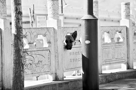 近日,丹江公園內一只大狼狗經常藏在欄桿后面,只露出一個狗頭,讓不少行人受到驚嚇。
