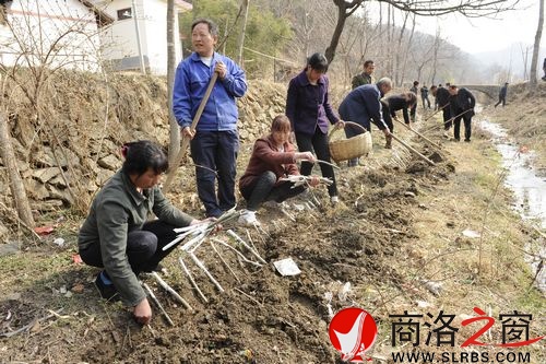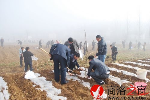 山陽縣直機關五百多名干部職工深入十里鋪鎮鵑嶺村栽種核桃樹苗千余株,幫助當地村民發展核桃產業。(嚴曉鋒 攝)