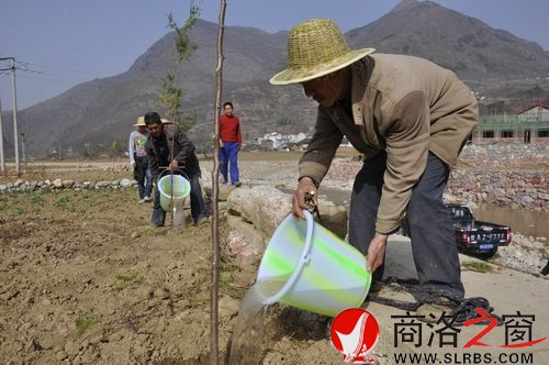 連日來,在鎮安縣米糧鎮豐河村熨斗灘河堤和通組公路邊,鎮上的領導干部職工和剛剛忙完春耕的群眾揮鍬鏟土,擔水澆灌,擴盤修剪,掀起了春季造林綠化熱潮。 (陳紹有 攝)