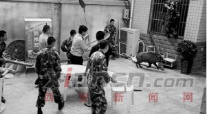 6月6日,一頭野豬突然闖進了商洛學院校區后又沖上街頭,為了防止野豬傷人,當地政府緊急調集公安、林業等部門百余人圍堵,野豬最終在城中村一處巷道被捕殺。