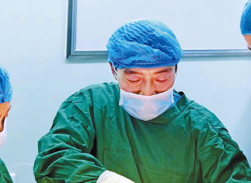 在這種情況下,趙岳峰立即做好術前準備,決定由他主刀進行手術。由于患者要做雙側開顱,手術時間長達8小時,過程中他明顯感覺身體缺氧、頭昏頭痛,最后是吸著氧氣才順利完成手術。術后患者恢復良好,出院時患者的語言及肢體功能已基本恢復正常,這也成為阿里地區人民醫院第一例顱骨修補術。3個月后,他再次成功對該患者進行了雙側顱骨缺損鈦網修補手術。