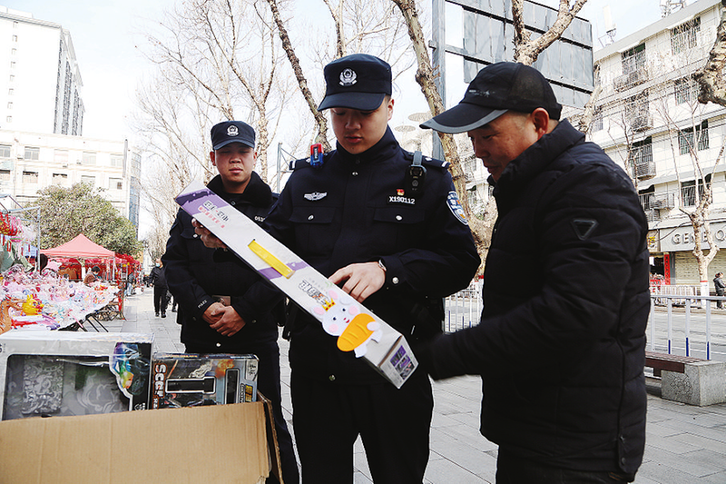 “老板,過年售賣這些玩具槍要正確引導一下孩子,彈射力較大的不能售賣。”2月15日,在市文化廣場一個玩具攤點前,一名身著警服的青年一再叮囑老板。隨后,他與同事又走到另一家攤點前查看。