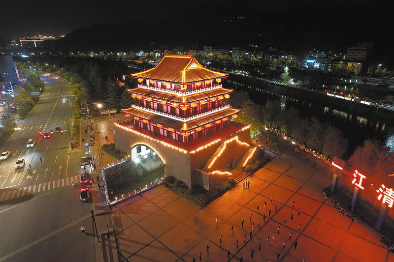 4月15日傍晚,位于丹江河畔的丹鶴樓燈火通明,人們在美麗的燈光中跳廣場舞。丹鶴樓古樸的氣質與活力四射的現代音樂完美交融。