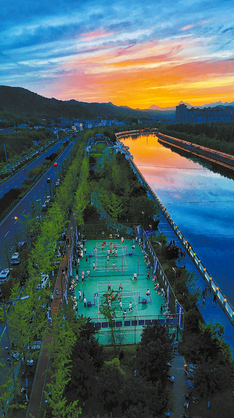 5月11日傍晚,在絢麗的晚霞映照下,濱江銀杏公園里氣排球比賽在如火如荼地進行中。