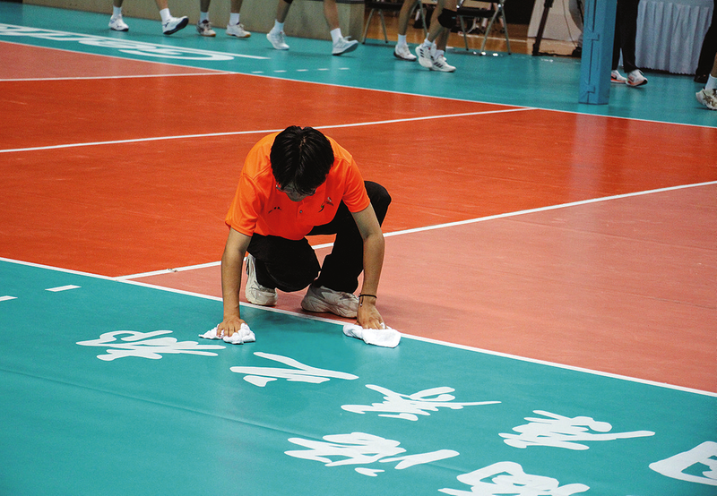 5月16日,比賽間隙,志愿者快速擦干地板上的汗水,防止運動員滑倒。