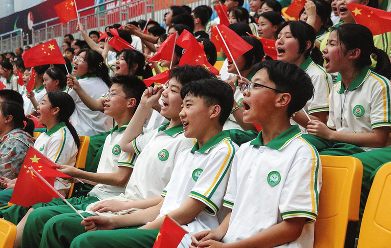 5月16日排球比賽中,商州區九年制學校的初中生為排球運動員助威吶喊。