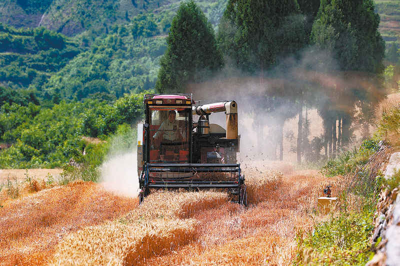 5月31日,丹鳳縣棣花鎮兩嶺社區馬鞍嶺小麥種植基地里,收割機來回穿梭,正在收割。