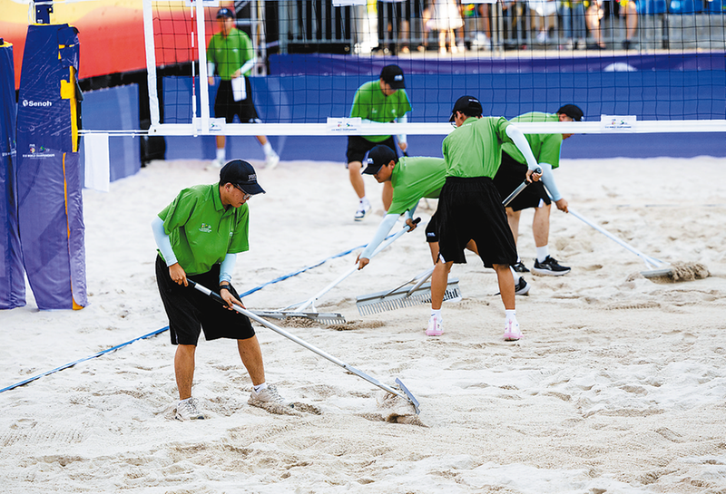 志愿者用平沙耙整理場地