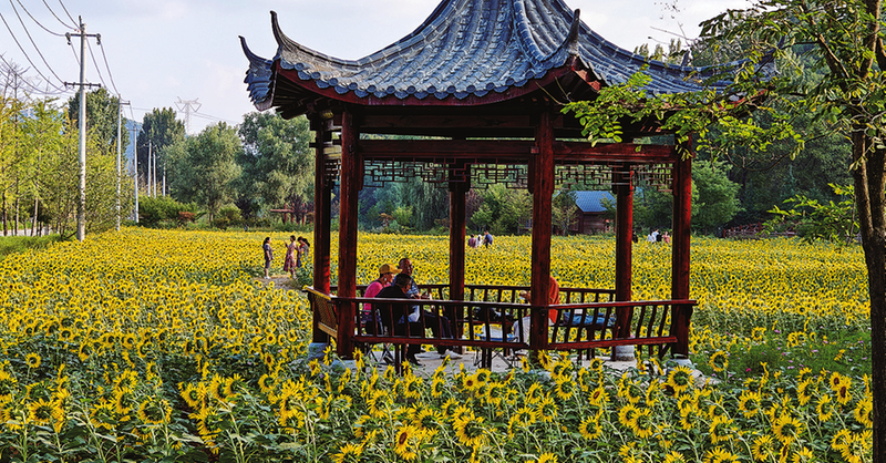 9月15日,商州區江山景區的油葵花盛開,吸引了眾多游客前來打卡。