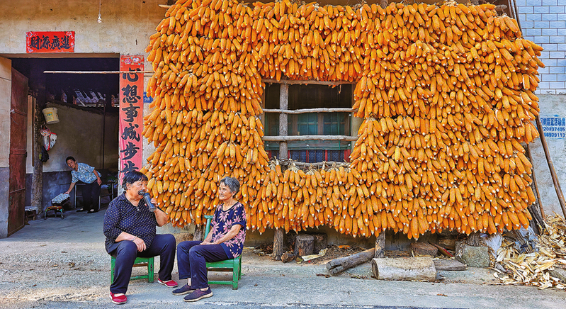 9月16日,商州區牧護關鎮一農戶家,金色的玉米將房屋裝點得別有生趣。