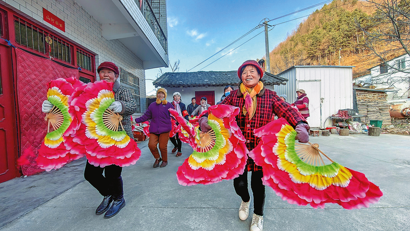 商州區(qū)楊斜鎮(zhèn)居民在農(nóng)家小院排練秧歌