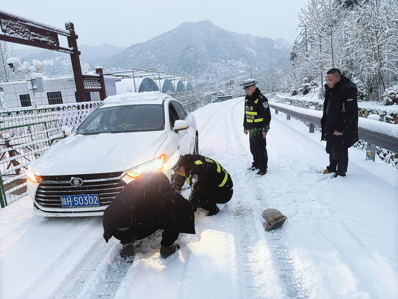 1月25日,丹鳳縣公安局交管大隊巒莊中隊出動全體干警在道路沿線進行管控和安全提醒,幫助路過群眾安裝防滑鏈。 (本報通訊員 李 軍 攝)