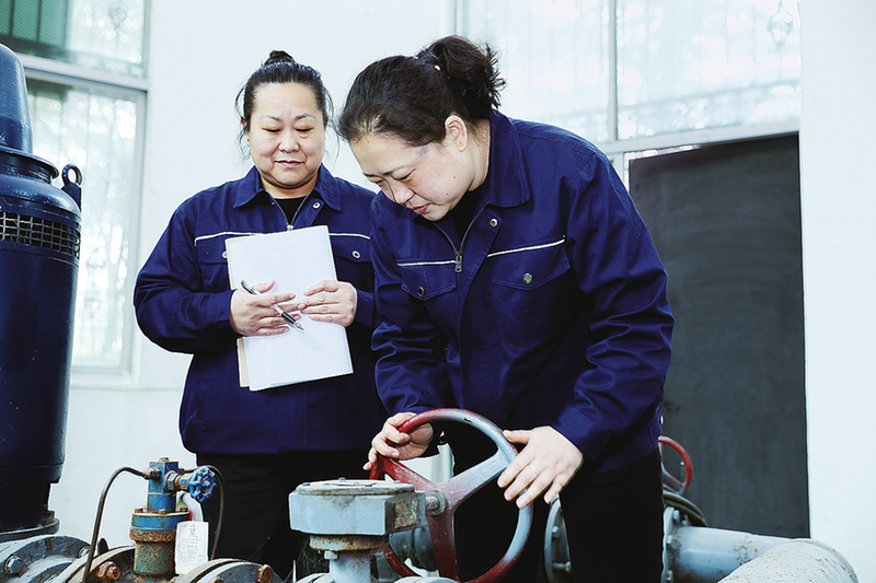 3月3日,商洛市自來水公司水源井的運(yùn)行工王娜(右)和謝艷敏(左)正在檢查閥門。她們說,由于水源井24小時運(yùn)行,這個崗位全年無休,作為女性需要克服許多困難,但能夠?yàn)槌菂^(qū)保障供水貢獻(xiàn)自己的力量,所有的付出都是值得的。