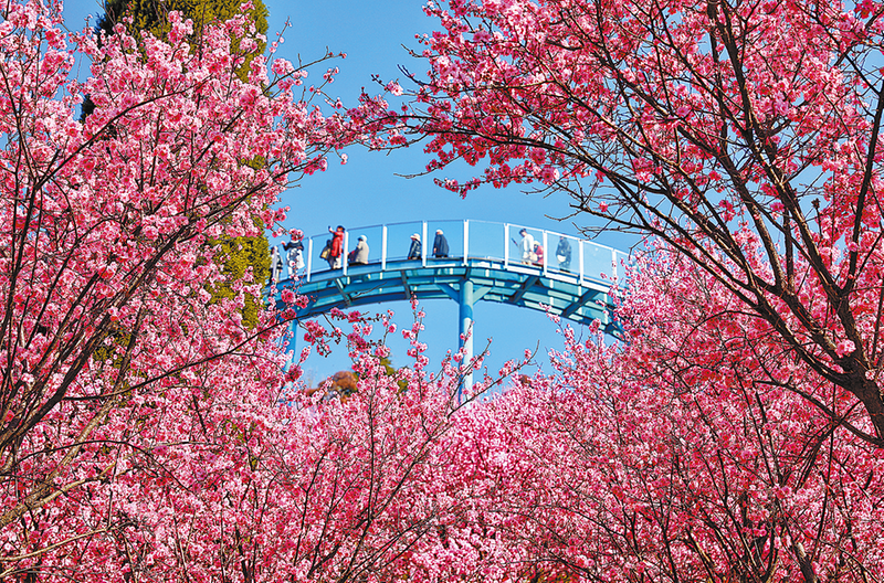 4月2日清晨,商州區(qū)金鳳山生態(tài)花海公園的紅梅與玻璃棧道上觀景的游人相映成趣。