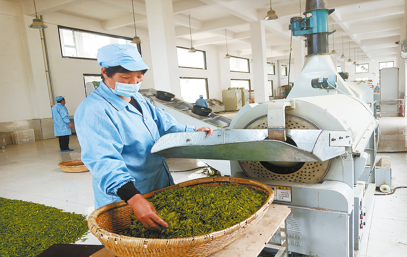 沁園春茶業有限責任公司的加工車間內,機器聲轟鳴、茶香四溢,工人正有條不紊地處理著剛剛采摘回來的春茶,經過理條、殺青、烘干等一系列生產步驟,最終制成優質的茶葉。