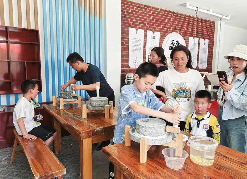 “五一”假期,洛南縣音樂小鎮推出快閃巡游、民謠歌會、玩偶巡游、馬戲表演、打鐵花及非遺美食體驗等豐富多彩的活動。圖為游客帶孩子體驗傳統石磨制作工藝的樂趣。 (本報記者 張 英 攝)