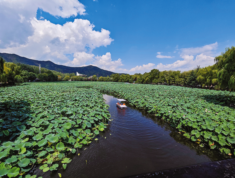 8月20日,在丹鳳縣棣花古鎮,游客在千畝荷塘間劃船。