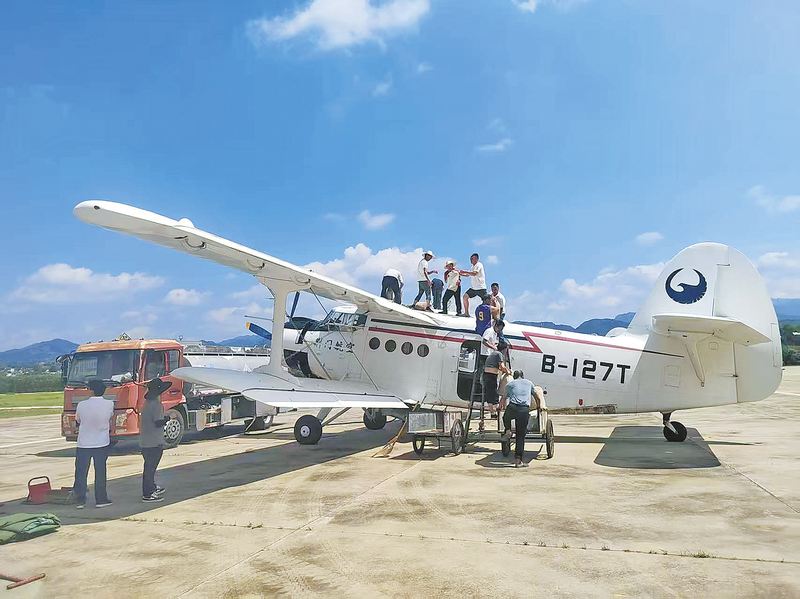 △市飛播站組織裝種隊向飛機上加裝樹種,為播撒“綠色希望”做好準備。