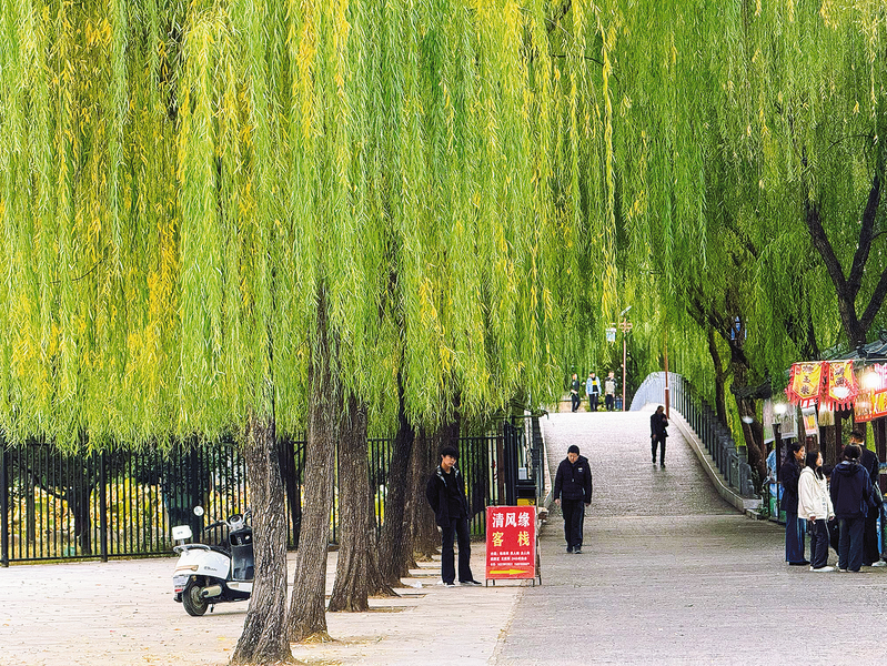 在丹鳳縣棣花古鎮(zhèn),柳枝翠綠中夾雜著金黃,如美女柔順的發(fā)絲千萬(wàn)條垂下,別具一種秋日的美。