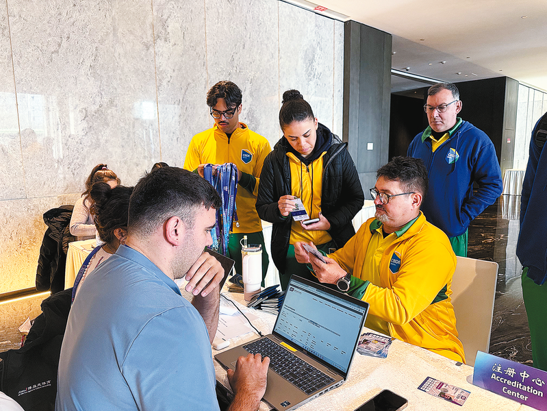 12月3日,U15世界中學生排球錦標賽報到現場,來自全球18個國家及地區的參賽隊伍陸續抵達報到處,現場秩序井然、活力滿滿。圖為巴西隊隊員正在工作人員指引下,有序辦理報到手續、領取參賽證件。(本報記者 謝 非 攝)