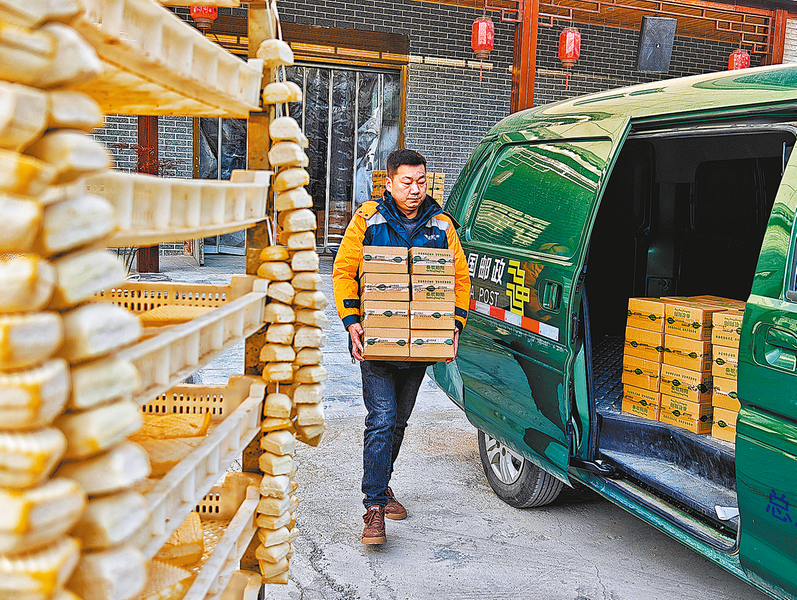 △在電商活動中,商洛郵政幫助洛南6家合作社銷售12款農產品共計1.1萬單。圖為郵政工作人員上門攬收豆制品快件。