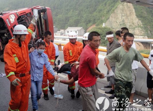 據正在搶救現場的商州消防中隊指導員劉欣介紹,貨車是在下立交橋時速度太快,直接翻車的。當時車內共兩個人,一人被夾在駕駛室內,出不來,受傷嚴重,情況危急。他們是6點41分接到報警的。帶隊立即趕到了現場。
