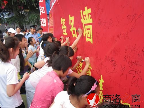 本網訊 (見習記者 沙莎)6月26日是第二十五個“國際禁毒日”,我市在中心廣場舉行大型宣傳教育活動,呼吁全社會向毒品宣戰,全民參與禁毒。圖為商州城關小學學生在簽名墻上簽名。