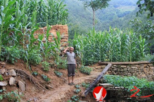 好不容易翻過坡、走過平洼地,再爬到另一座山的半山腰,才看到了一些玉米地,眼里漸漸地顯出一戶人家,那是用石塊砌成的房屋,門檻上坐著一個個子矮矮的、佝僂著身子的老人,她是王忠慶的老伴。一聽說有人來找王忠慶,便著急的用手中的拐杖指著房子側(cè)面的山坡。原來,王忠慶去山上的地里鋤草去了,剛走不久。