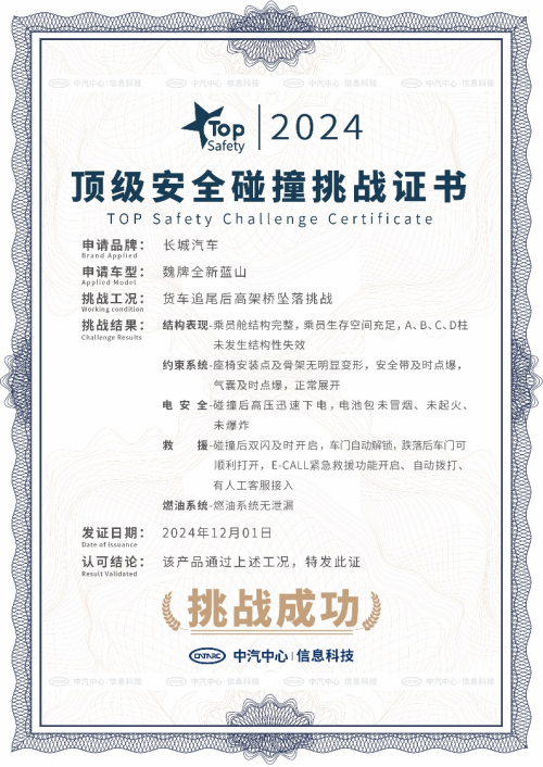 2024年12月2日-4日,在第13個全國交通安全日之際,作為長城汽車旗下高端新能源品牌,魏牌攜手中汽中心TOP Safety開展了一場難度極大的“行業首個高架橋墜落挑戰”。作為此次挑戰的主角,魏牌全新藍山以卓越的整車、電池、主被動、智駕等安全性能,成功通過這一極限測試,再次印證了其在安全領域的強勁實力和領先地位。