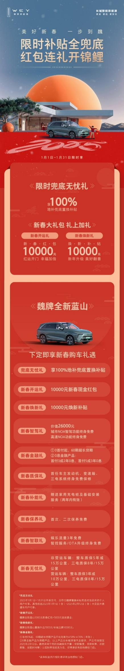 如今,新春換車季已然來臨,全新藍(lán)山限時(shí)補(bǔ)貼和紅包福利火熱開啟?,F(xiàn)在購買魏牌全新藍(lán)山即可立享100%地補(bǔ)兜底置換補(bǔ)貼、10000元新春現(xiàn)金紅包、10000元煥新補(bǔ)貼、價(jià)值26000元城市NOA智駕功能終身免費(fèi)&高速NOA功能終身免費(fèi)、首任車主發(fā)動(dòng)機(jī)&變速箱&三電系統(tǒng)終身免費(fèi)保修、贈(zèng)送家用充電樁及基礎(chǔ)安裝服務(wù)(兩年內(nèi)有效)、首次二次保養(yǎng)免費(fèi)、娛樂流量3年免費(fèi),智控服務(wù)/OTA升級終身免費(fèi)、非營運(yùn)車輛整車質(zhì)保5年/15萬公里、三電質(zhì)保8年/15萬公里、營運(yùn)車輛整車質(zhì)保3年/10萬公里,三電質(zhì)保8年/15萬公里等超值購車禮遇,同時(shí)還有首付0%起,60期超長貸期和0息金融產(chǎn)品。對追求穩(wěn)健性能和智能豪華體驗(yàn)的用戶來說,現(xiàn)在正是入手全新藍(lán)山最佳時(shí)機(jī)!感興趣的朋友們,歡迎前往長城智選店試駕體驗(yàn)~