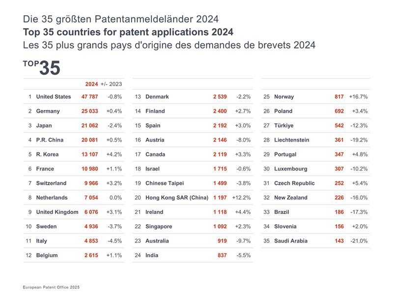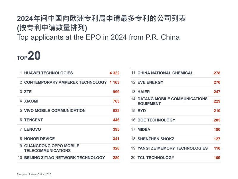 慕尼黑/北京,2025年3 25日-— 2024年,中國企業和研究人員向歐洲專利局(歐洲專利局,(epo”)提交了20,081件專利申請,創下歷史新高。中國提交的專利申請量位居全球第四