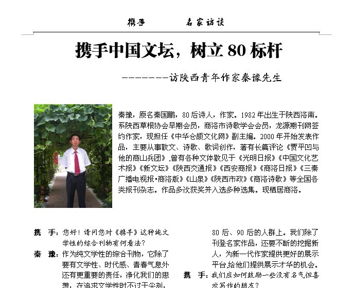 9月11日,商洛市詩歌學(xué)會會員、陜西草根協(xié)會早期會員、新生代80后作家、中華倉頡文化網(wǎng)副主編秦豫(秦國鵬)先生應(yīng)邀做客《攜手》名家專訪。《攜手》雜志主編,攜手青年作家協(xié)會主席海鵬先生擔(dān)任了本次專訪的總顧問。先將采訪現(xiàn)場實錄于下,敬請關(guān)注,以饗讀者。