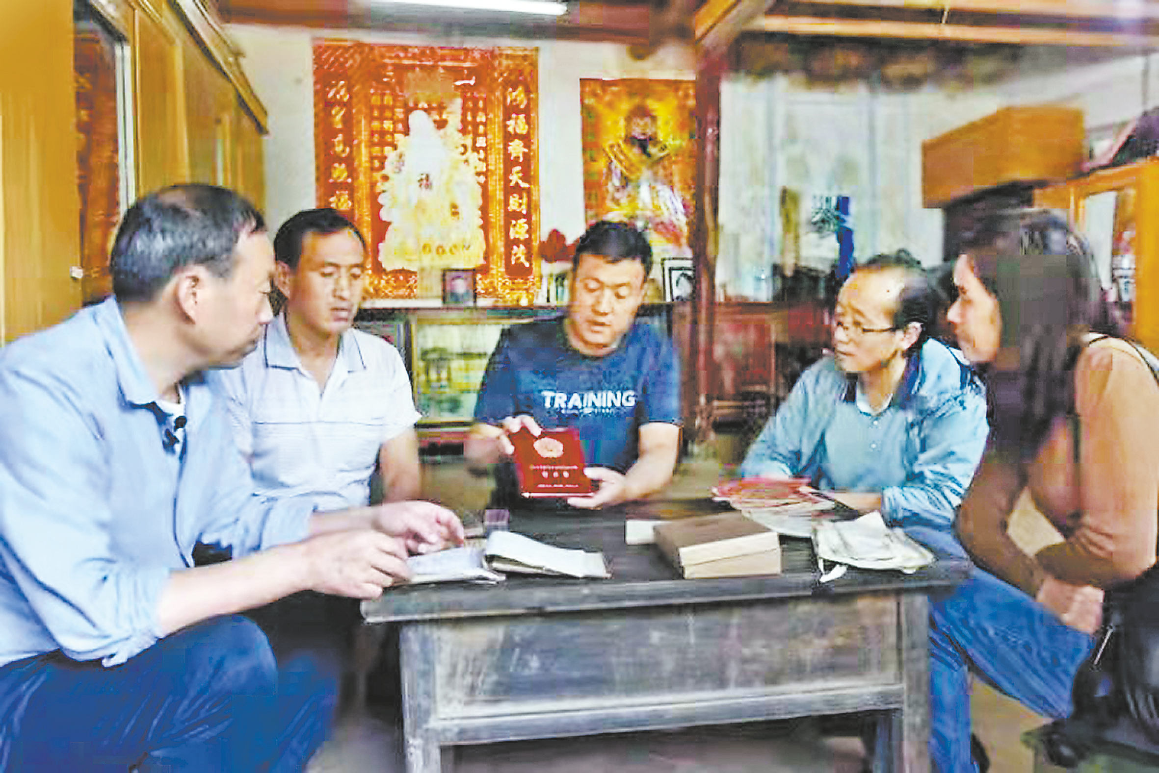蘇全發的3個兒子向我們展示老人的紀念章。左一為大兒子蘇占省,左二為小兒子蘇占榮,中間為二兒子蘇占勝。 (田 波 攝)