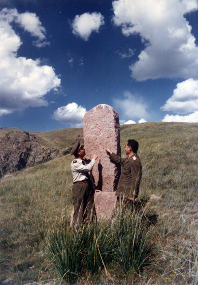 劉丙寅(右)在邊界勘察界碑